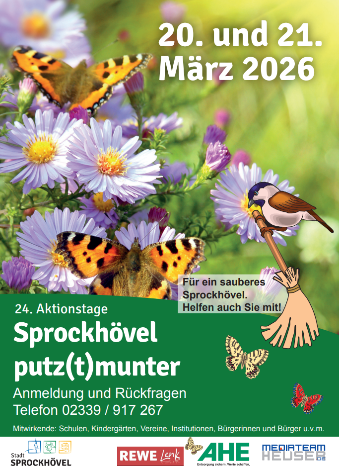 Sprockhövel macht Frühjahrsputz: Die Gemeinschaftsaktion „Sprockhövel putz(t)munter“ findet in diesem Jahr zum 24. Mal statt. Am 20. und 21. März 2026 sind wieder alle Sprockhöveler Vereine, Kindergärten, Schulen, Unternehmen, sonstige Institutionen und Privatpersonen aufgerufen, Grünanlagen, Straßen, Wege und Plätze im Stadtgebiet zu reinigen. „Wir freuen uns sehr, auch in diesem Jahr die Aktionstage für mehr Sauberkeit zu organisieren und hoffen wieder auf zahlreiche Unterstützung aus der Bürgerschaft“, so Bürgermeisterin Sabine Noll.